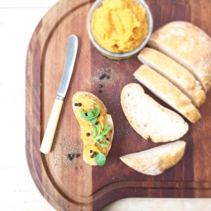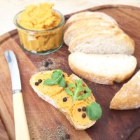 What do you put on your sandwiches? It’s a question I get quite a lot. Of course you can spread your toast and sandwiched with nut butters, jam or houmous, but there are so many spreads you can make yourself, to add nutrition and to enjoy something different. Today I’m giving you a spread made of sweet potatoes. The great thing about this spread is that you can make sweet and savoury combinations. Spread it on a piece of toast, sprinkle some nuts and drizzle some agave nectar on it and you have a great sweet breakfast or snack. Combine it with some spicy rucola and black peppers and you will have a yummy savoury variant. You can of course also add cucumbers, tomatoes, lettuce.. you can combine endlessly. It’s great for a bbq too! Check out Vegan Partying for some bbq ideas and serve this spread for the baguettes (and salads). I’m sure everybody will love it!