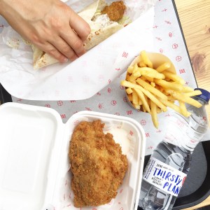 A fellow Dutch vegan here in London asked to meet up and so I suggested to go here. She already went once and said it was yum. What made me even more curious. I really wanted it to be good, haha! So we met at Hackney Central station and from there it’s only a few minutes walk. It wasn’t very hard to see where it was, because there were so many people enjoying their meal already. The Temple of Hackney is definitely a magnet. I chose the ‘2 piece’ and a regular fries. My friend chose a wrap. I was so excited to try it and I was delighted after the first bite. This
