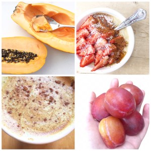 I just picked a random day: I always start my day with a big glass of luke warm water, the juice of half a lemon and 1 tsp of apple cider vinegar. This isn’t something I love drinking, but it gives me a good feeling as it gives me energy and a boost of vitamin C. It also has a cleansing effect and for me it’s perfect to start my day. About an hour later I drink my green smoothie. This is a smoothie with 2 very ripe bananas, a big handful of spinach, 1/2 tsp spirulina, 1/2 tsp wheatgrass and 1 tsp of linseed. I use a little bit of water to blend it. I had this with 1/2 a medium sized papaya. When I got to work they had a bowl full of delicious fresh plums from the garden they went to at the weekend. So I just had to snack on those in the morning. So delicious! It makes me think of my childhood as we had 2 plum trees, full of plums, in the garden where I grew up. A little later in the morning I was quite hungry weird enough, so I made myself a small bowl of porridge. As a topping I used some strawberries, coconut, cinnamon and a little bit op agave nectar. Just to keep me going until lunch time.