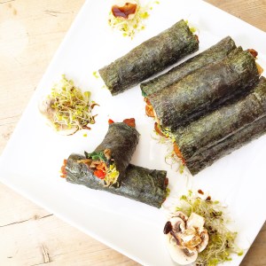 -Put 1/10 of the mushrooms and spinach (about 2 tbs) on a nori sheet.