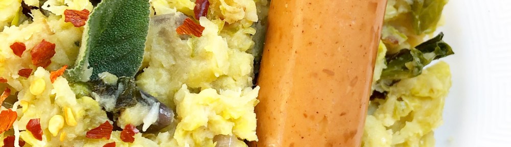 Remember the recipe ‘Stamp-Pot‘? A great dish for this cold winter weather and that’s why.. Here is another stamppot recipe! This time with brussels sprouts, sage and with ‘rookworst’ (it’s a Dutch sausage: smoked sausage) from the Vegetarsiche Slager (Vegetarian Butcher). This one is soooo good. I even find it much better than the original rookworst, because the taste and structure are the same, but it doesn’t have all the fat dripping out (also, it doesn’t have any mashed up animals in it, which is a big pre!). Unfortunately, they don’t sell this in the UK (yet?), but you can use any other plant-based sausage to substitute it. Preferably sausages with a smoky flavour. I loveeee brussels sprouts, but even people who aren’t a big fan of this least liked vegetable, do often like this recipe. So give it a try!