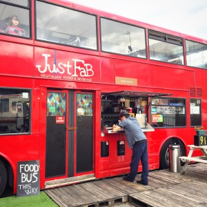 Just Fab is not just a restaurant, but it’s actually a bus. An old London bus which is used as a kitchen and a restaurant. It’s located in Hackney and just a 10 minute walk from Bethnal Green. It’s very easy to find and you can hardly miss it once you’re in the right street. There is a huge entre with paintings of the bus. There is an outside bit where you can sit, made of wooden pallets, bus seats and old wooden things. Very inventive! There is a lovely black cat too, who is happy to be stroked. When coming through the entre, the bus is right in front of you. You order from the outside, before you find a seat outside or upstairs.