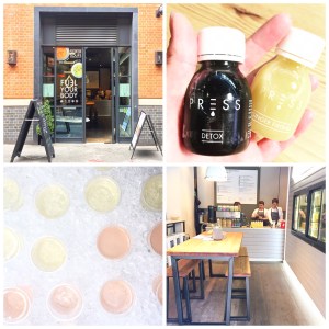 I actually wanted to try the Chia Bowl, but they run out of it unfortunately. So I went for an Acai Bowl. I love acai! I also saw they had a Golden Latte and I thought it was like a turmeric latte. So I ordered that one too, but it turned out to be coffee. Silly me, because it was clearly listed under ‘coffees’. The acai bowl was super nice. It had some lovely toppings too: blueberries, goji berries, granola and almonds. It was very cold, so definitely very perfect for a hot day. The taste was very good, with a great acai flavour. The colour was define really, a beautiful soft purple! I couldn’t drink the coffee, because I really really don’t like coffee. I also didn’t want to give it back, because I didn’t want them to throw it away. I gave it to the lady behind the till in the shop I went for my brother later on. She was so happy and that gave me a good feeling, so not a waste. Press gave me 3 things to try too. One of them was a pineapple juice, to boost your immune system and to hydrate. I found out there is honey in there unfortunately, so I can’t review this. I gave it to the girl sitting next to me at the moment (I’m giving lots of things away today!). They also gave me 2 shots: Detox and Ginger Fireball. The detox shot is with coconut water, lime, ginger, aloe vera activated charcoal (super hot at the moment!) and milk thistle. I’m very excited about this one, it’s very nice! The ginger fireball one contains ginger (50%!!), pineapple and lime. It’s burning good!