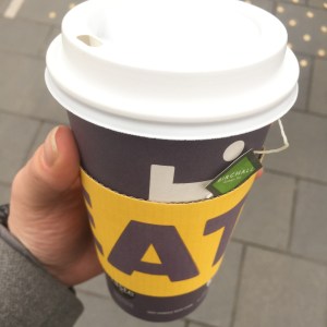 They are doing a lot better with the vegan option I must say. There were houmous-harissa sandwiches, a quinoa salad with veggies and seeds and even a warm dish with sweet potato and spinach. They also sell fruit, but nothing else to snack on. They do sell lots of non-vegan cakes and bars, so it would be nice to add 1-2 vegan options to that. I already had my lunch at Strada, next door, so I wasn’t in for a meal. Would have been so nice if they had a nice nut bar or chocolate brownie or something?! I ordered a green tea with soy milk and the girl who helped me was really friendly and nice. I really appreciated that!